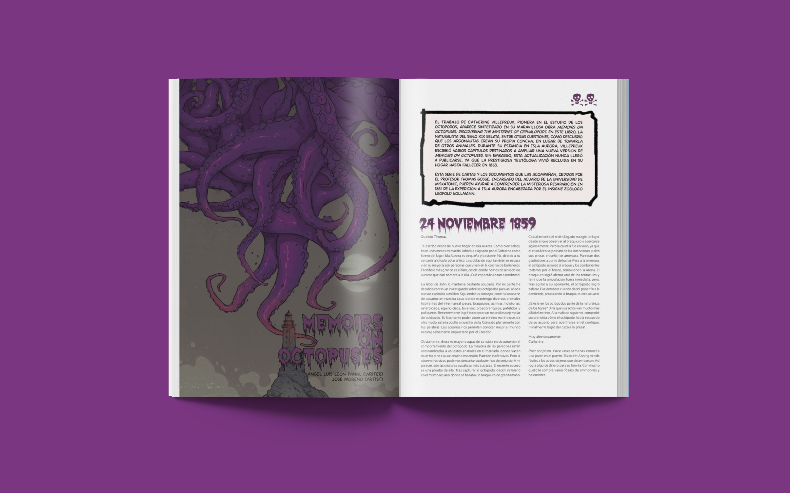 El trabajo de Catherine Villepreux, pionera en el estudio de los octópodos, aparece sintetizado en su maravillosa obra «Memoirs on Octopuses: Discovering the Mysteries of Cephalopods». En este libro, la naturalista del siglo XIX relata, entre otras cuestiones, cómo descubrió que los argonautas crean su propia concha, en lugar de tomarla de otros animales. Durante su estancia en Isla Aurora, Villepreux escribió varios capítulos destinados a ampliar una nueva versión de Memoirs on Octopuses. Sin embargo, esta actualización nunca llegó a publicarse, ya que la prestigiosa teutóloga vivió recluida en su hogar hasta fallecer en 1863. Esta serie de cartas y los documentos que las acompañan, cedidos por el profesor Thomas Gosse encargado del acuario de la Universidad de Miskatonic, pueden ayudar a comprender la misteriosa desaparición en 1861 de la Expedición a Isla Aurora encabezada por el insigne zoólogo Leopold Kollmann.