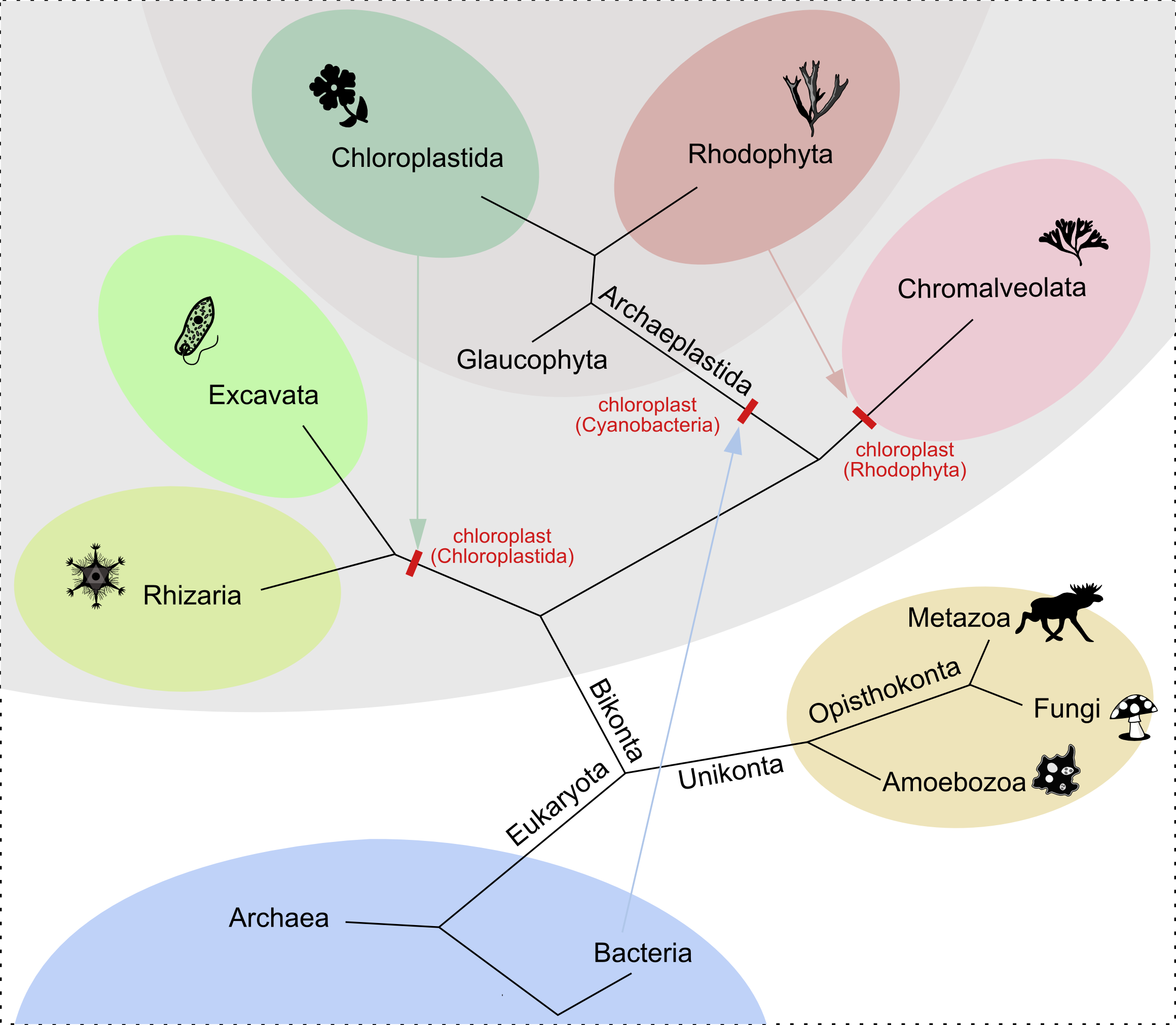 La base del árbol eucariota está formado por varias ramas, entre las que destacan aquellas que representan al reino Animalia, Plantae y Fungi (hongos). El resto de linajes son los que se conocen como protistas que, ante la falta actual de datos evolutivos, los investigadores suelen agrupar de diferentes formas. Pero, aunque no deja de ser un cajón de sastre, hay cierta luz que nos permitirá seguir dibujando el legado de las cianobacterias.