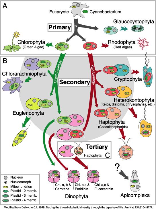 Otra línea de algas verdes está en el origen de grupos protistas, que surgieron tras un proceso de endosimbiosis secundaria. Esto sucedió tras la fusión de un eucariota no fotosintético y un alga verde. Este proceso se ha dado muchas más veces, teniendo como protagonistas fotosintéticos a algas verdes y rojas. En algunos grupos de protistas las endosimbiosis se han sucedido hasta llegar a terciaria e incluso a una cuarta. De esta forma aparecen organismos que, como las muñecas rusas, guardan tras varias membranas celulares a un descendiente de las cianobacterias.