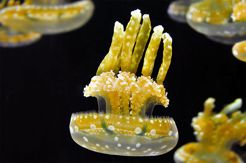 No podemos despedirnos de las zooxantelas sin mencionar su relación con las medusas de oro, que habitan en una de las Islas Roca de Palaos. Aquí encontramos el lago de las Medusas, declarado Patrimonio de la Humanidad por la UNESCO en 2012. Dicho lago es de agua salada y en él quedaron atrapadas una población de medusas del género Mastigias, tras cerrarse el paso a mar abierto. El aislamiento y la falta de alimento propiciaron la simbiosis con zooxantelas que le proporcionan gran parte del alimento que necesitan. Lo único que tienen que realizar estas medusas es recorrer la superficie del lago siguiendo los rayos del Sol.