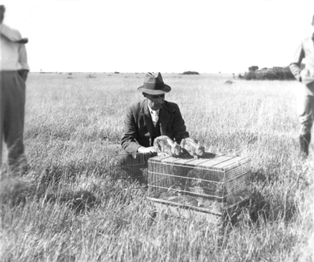 🐇 La isla Wardang, situada en la costa sur de Australia, fue el lugar elegido por el Australian Council for Scientific and Industrial Research para realizar una serie de experimentos. El objetivo era comprobar la eficacia de un virus contra la plaga de conejos que Australia estaba sufriendo desde hacía décadas, tras ser introducidos por los colonos. El 16 de noviembre de 1937 fueron liberados los primeros conejos infectados con mixomatosis en Wardang. En ese mismo lugar, pero en 1938, se tomó otra fotografía, que podemos considerar ya icónica, de un gran grupo de conejos bebiendo en un abrevadero en el interior del recinto de ensayos. Posteriormente, en 1950, la cepa SLS del virus fue liberada en Australia, causando una reducción drástica de las poblaciones de conejos. Sin embargo, para la década de 1990 el número volvería a crecer debido a que los conejos habían adquirido, por evolución, resistencia genética a la enfermedad.