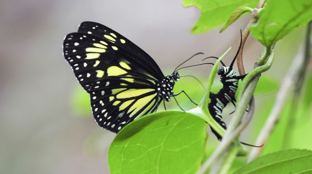 Una mariposa caníbal se aproxima a una oruga para sorber sus jugos 📷 Yi-Kai Tea