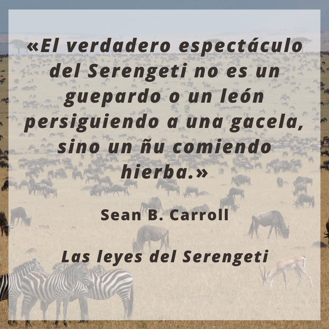🐆 «La revelación más importante de estos estudios a largo plaza es que, contrariamente a casi todos los documentales que se emiten por televisión, el verdadero espectáculo del Serengeti no es un guepardo o un león persiguiendo a una gacela, sino un ñu comiendo hierba, puesto que esa actividad banal, multiplicada por un millón o más, desencadena una cascada de interacciones en la sabana que lleva a que haya más depredadores, más árboles, más jirafas y también más ejemplares de otras especies.»