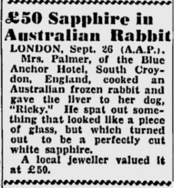LONDRES, 26 de septiembre (A.A.P.), La señora Palmer, del Hotel Blue Anchor, en South Croydon, Inglaterra, cocinó un conejo australiano congelado y le dio el hígado a su perro, «Ricky». Éste escupió algo que parecía un trozo de cristal, pero que resultó ser un zafiro blanco perfectamente tallado. Un joyero local lo valoró en 50 libras.»