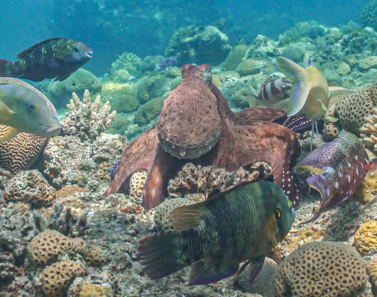 😲 Sin embargo, los pulpos de la especie Octopus cyanea han llevado este sistema a otro nivel más fascinante. Un reciente estudio ha revelado que estos pulpos lideran grupos de caza multiespecie, colaborando con varios tipos de peces. Este curioso equipo de cazadores trabaja en perfecta sinergia, con los peces explorando nuevas áreas y el pulpo decidiendo cuándo es el momento de atacar. «Los peces actúan como un sistema sensorial extendido para los pulpos, mejorando la detección de presas», explica Eduardo Sampaio, autor principal del estudio. Las especies participantes incluyen tres tipos de salmonetes (Parupeneus sp.), el mero de cola lunar (Variola louti) y el mero de puntas negras (Epinephelus fasciatus) 🐠